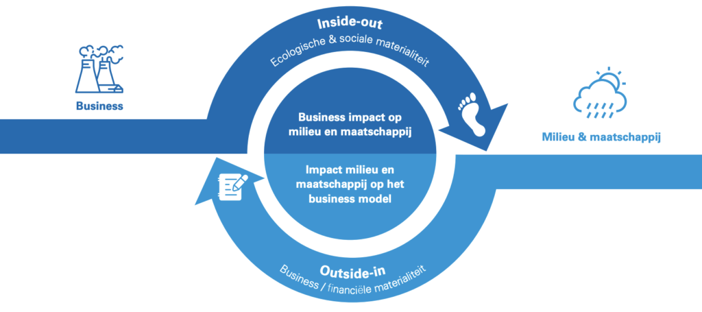 Examples include CO₂ emissions, loss of biodiversity or violation of human rights. So it is about impact on the organisation (outside in) and impact of the organisation on the environment (inside out).