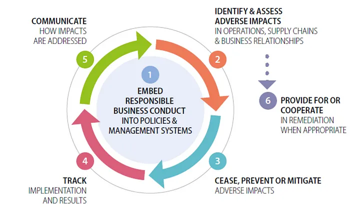 HRDD is het proces van het identificeren, beoordelen, voorkomen, verminderen en herstellen van negatieve gevolgen voor de mensenrechten, en het afleggen van verantwoording over hoe het bedrijf dit heeft gedaan.