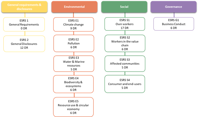 Elke standaard bevat ‘disclosure requirements’, onderwerpen waarover het bedrijf moet rapporteren en waarvoor ze doelstellingen moet formuleren, data verzamelen en beschrijven hoe ze op de betreffende doelstellingen scoort.